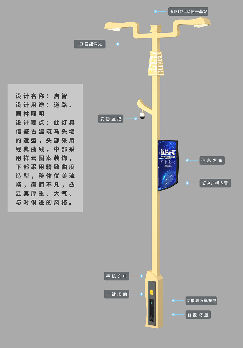 設計要點:此燈具借鑒古建筑馬頭墻的造型,頭部采用經(jīng)典曲線,中部采用祥云圖案裝飾,下部采用精致曲度造型,整體優(yōu)美流暢,簡而不凡,凸顯其厚重、大氣、與時俱進的風格。